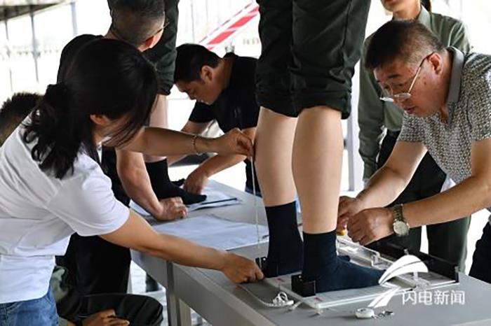 “剛開始她們集結(jié)的時候,初期量一遍,然后訓練一段時間,腿腫了,得再量一遍,再過一段時間,腿又消腫了,又量了一遍,然后正式上閱兵場之前,我們又量了一遍,所以一共是4遍?!倍麻L柳富林說,企業(yè)要給每個人做四雙不同尺碼的鞋,才能保證受閱隊員在每一個訓練階段都穿上了合腿合腳的鞋子。