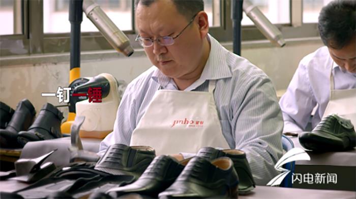 裁皮、片皮、壓襯、臥口、繃楦……生產(chǎn)車間內(nèi),數(shù)條生產(chǎn)線同時開工,幾十名手藝純熟的鞋匠雙手翻飛如行云流水,一釘一錘、一針一線間129道工序一絲不茍地完成。