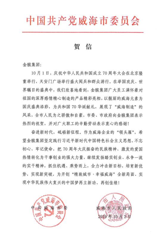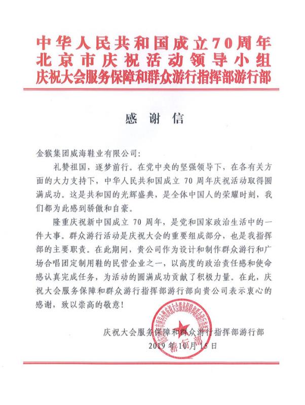 在各級黨委、政府的正確領(lǐng)導及各界朋友的關(guān)心支持下,金猴集團圓滿完成了慶祝新中國成立70周年閱兵的保障任務(wù),為威海也為金猴自己爭了光。