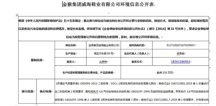 金猴集團(tuán)威海鞋業(yè)有限公司環(huán)境信息公開表