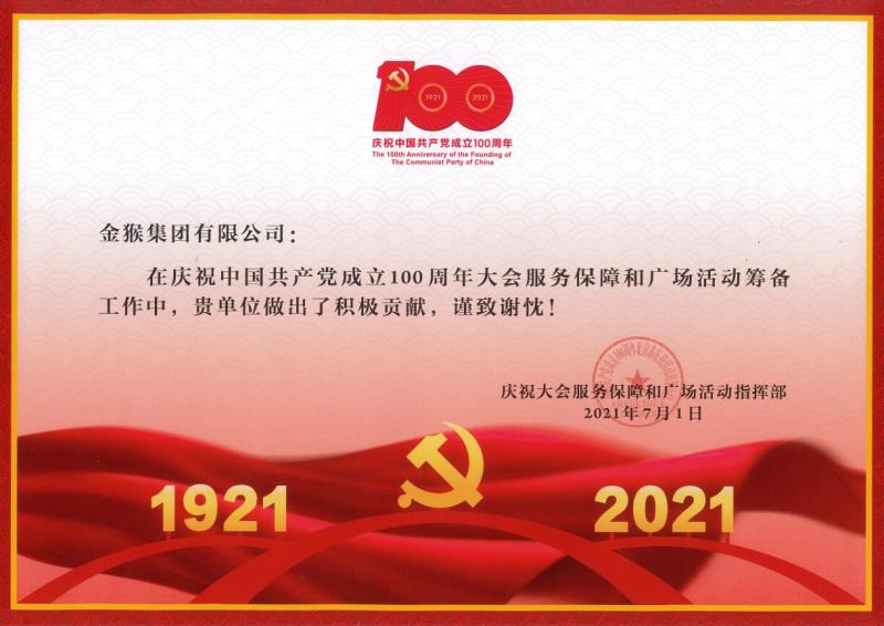 近日,中國共產(chǎn)黨成立100周年慶祝大會服務(wù)保障和廣場活動指揮部工作總結(jié)大會在北京召開,表彰在慶祝中國共產(chǎn)黨成立100周年大會服務(wù)保障和廣場活動籌備工作中做出積極貢獻(xiàn)的單位和個人,金猴集團(tuán)有限公司及宋鴻濤、王愛國、王福全、于杰四名同志被授予獎狀和證書。