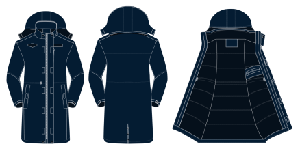 整體顏色為藏青色,款式為中長(zhǎng)大衣款式。具有阻燃、防靜電、防水、防風(fēng)等功能。