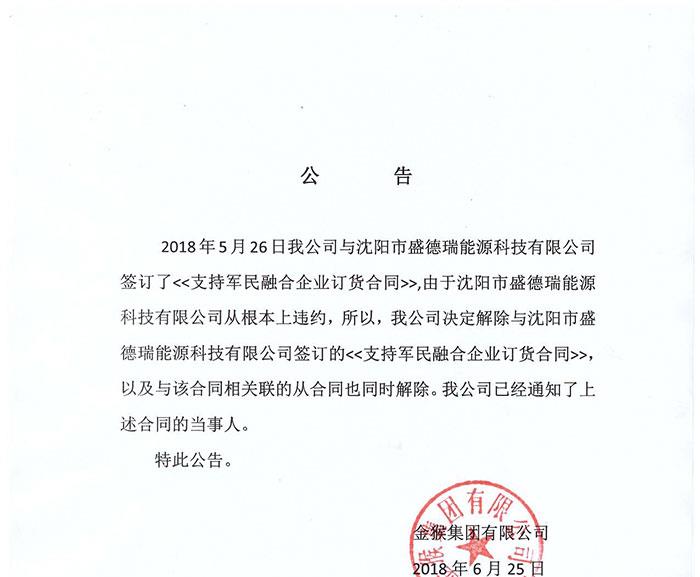 金猴集團(tuán)解除與沈陽(yáng)市盛德瑞能源科技有限公司簽訂的合同
